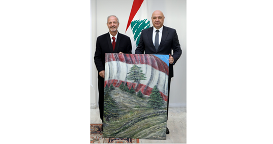 (*) عون تسلم من الفنان برنار رنو لوحة للعلم اللبناني مع شجر الأرز