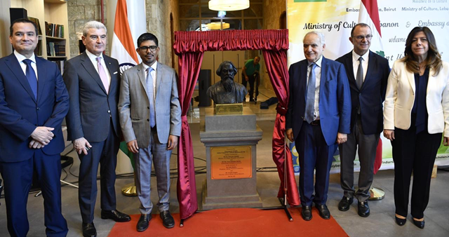 وزير الثقافة والسفير الهندي ازاحا الستار عن التمثال النصفي للفيلسوف طاغور خلال احتفال في المكتبة الوطنية - الصنائع