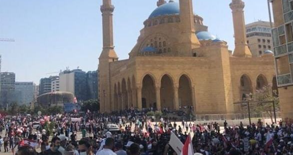 الحشود ملأت ساحة الشهداء والاعلام اللبنانية ترفرف في المكان.
